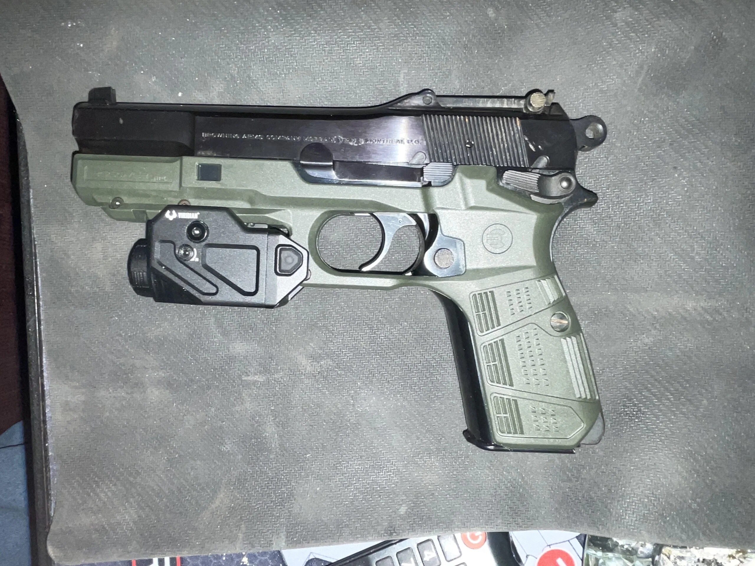 1995 Browning Hi Power 40 cal. I decided to pick up a set of Recover Tactical grip & rail panels in OD because I thought they looked interesting. Previously had Hogue grips with finger grooves, which I am a big fan of already but they’re somewhat boring.