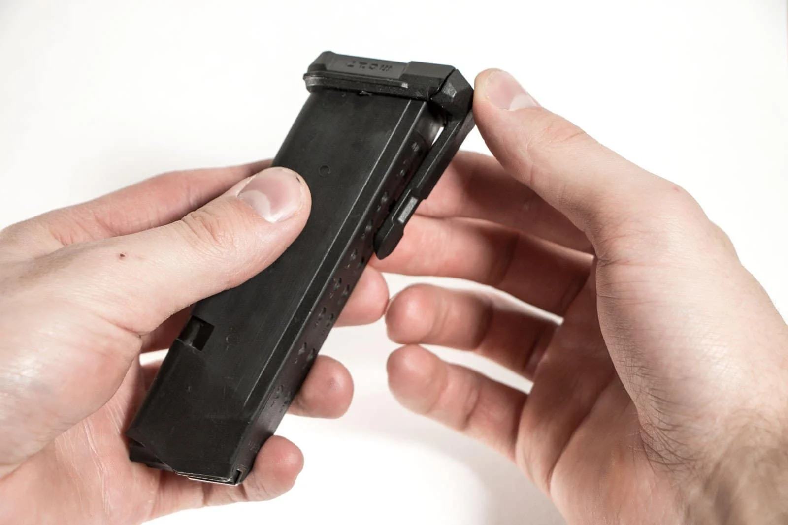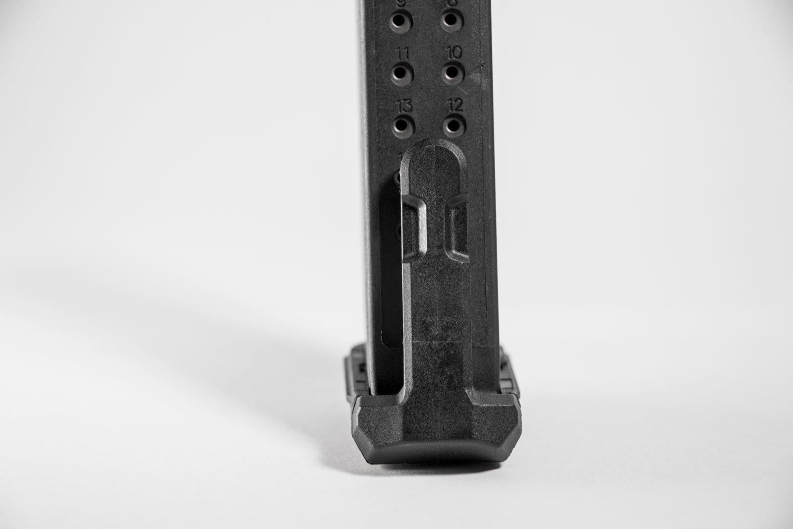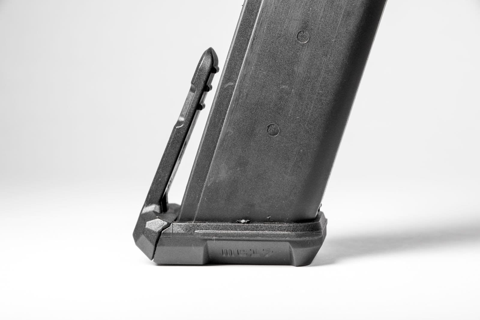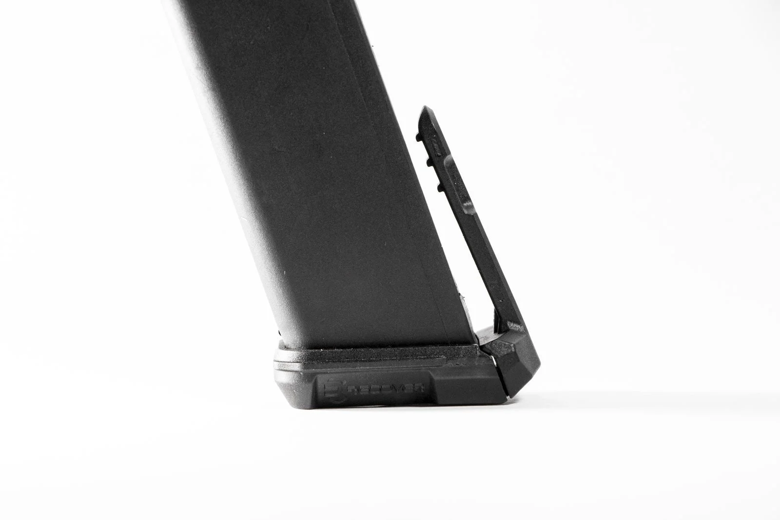 The Glock Magazine Base Plate System allows you to attach multiple accessories such a clip, rail, as well as an enhanced base plate.