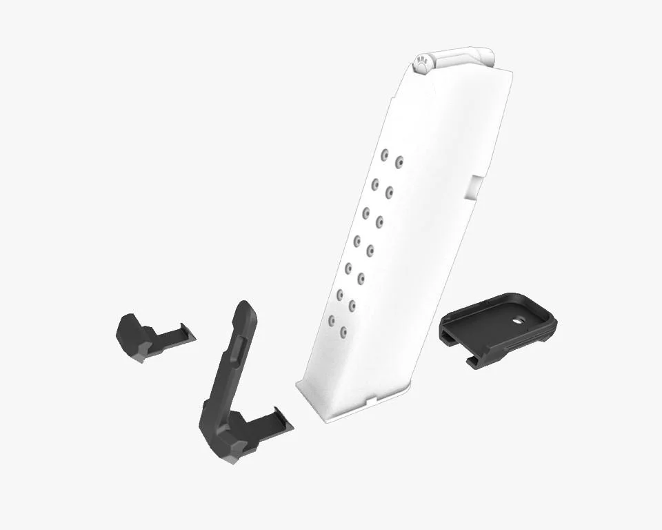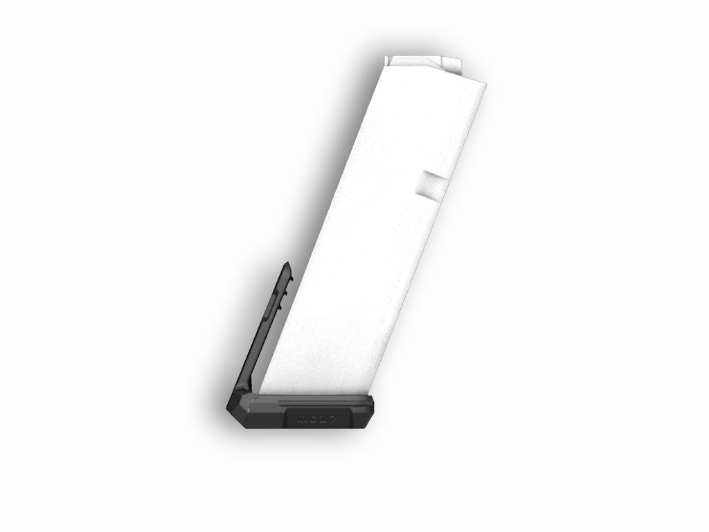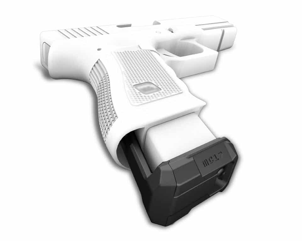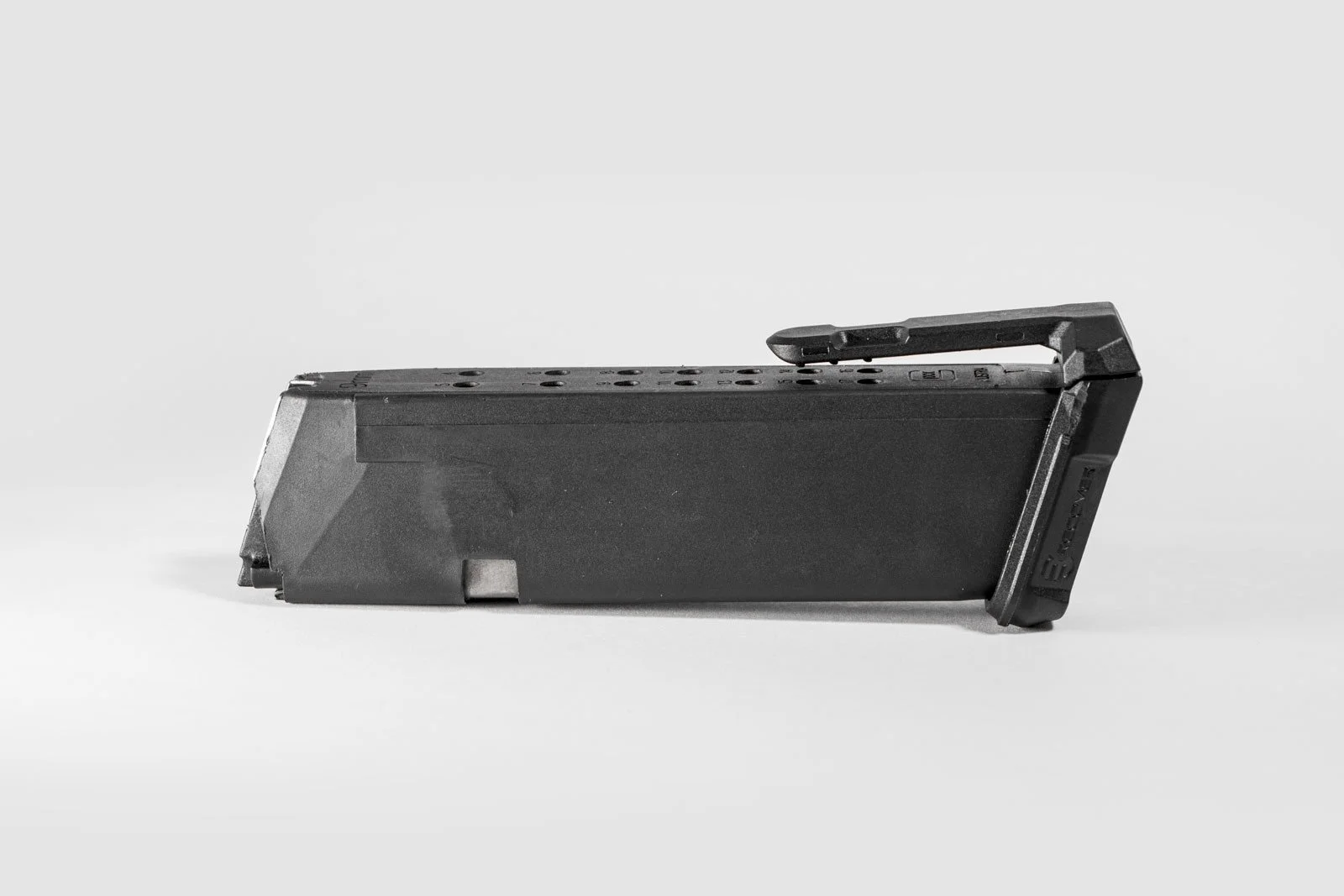 The Glock Magazine Base Plate System allows you to attach multiple accessories such a clip, rail, as well as an enhanced base plate.