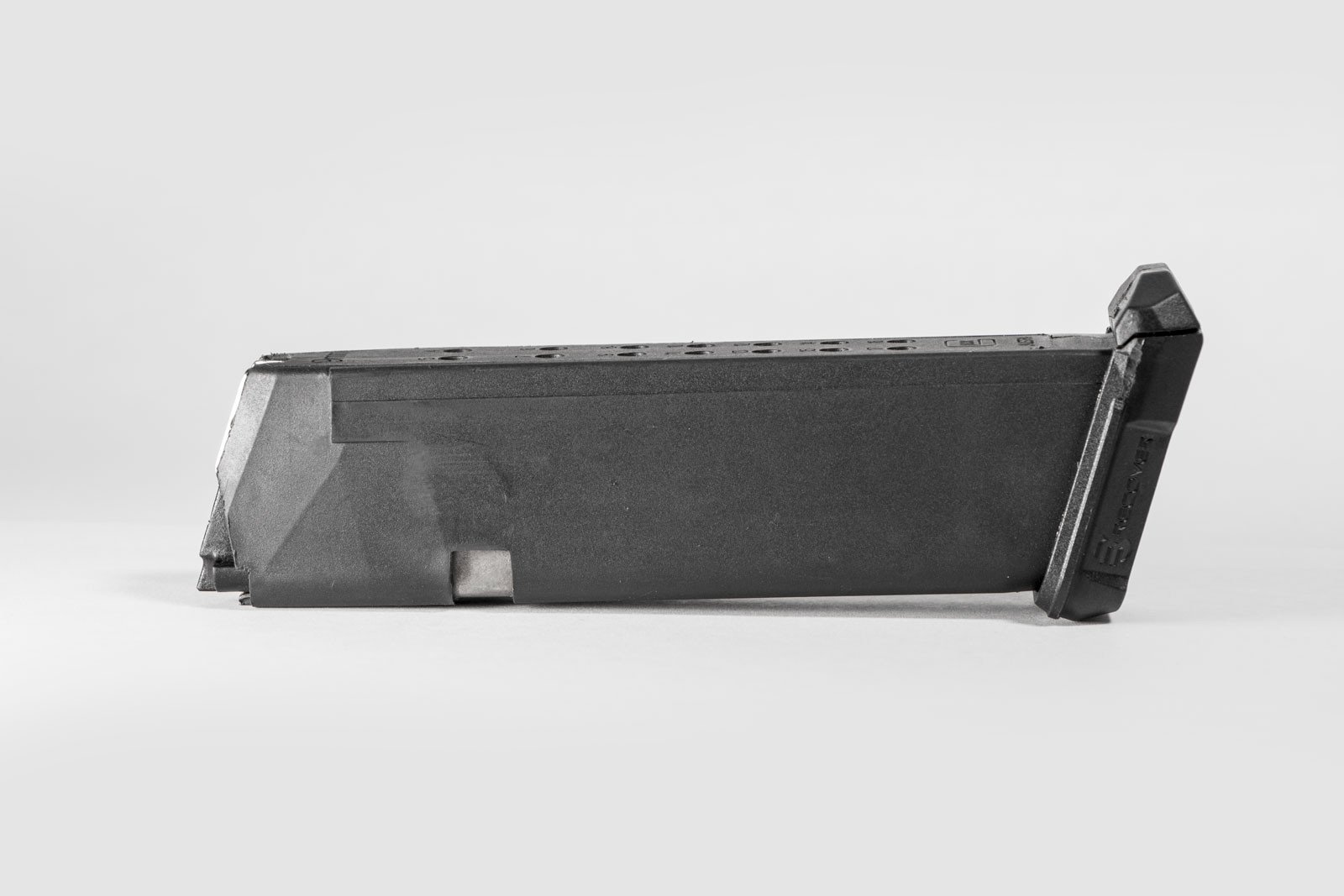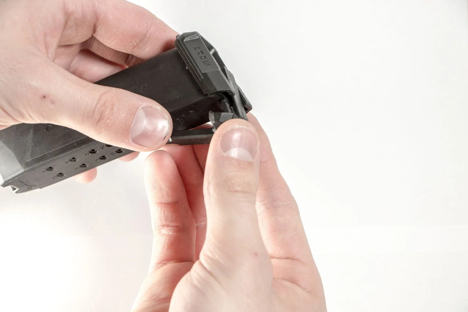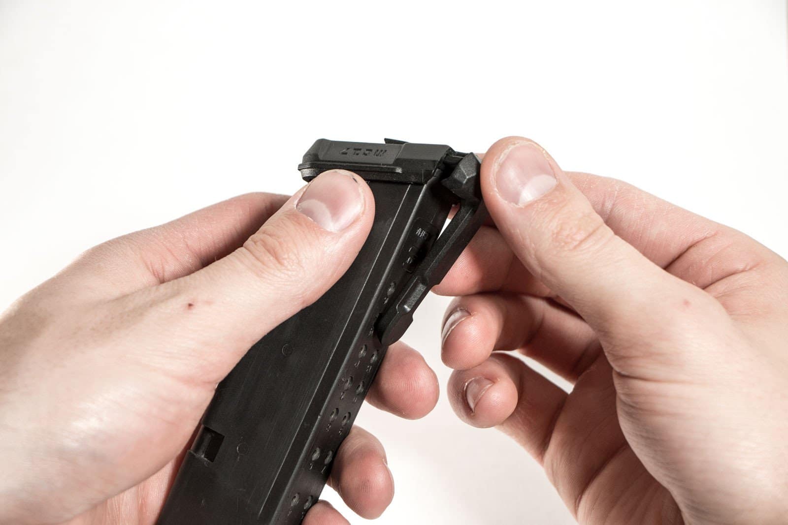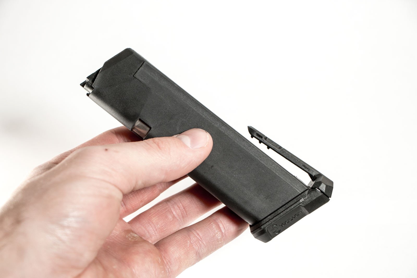 The Glock Magazine Base Plate System allows you to attach multiple accessories such a clip, rail, as well as an enhanced base plate.
